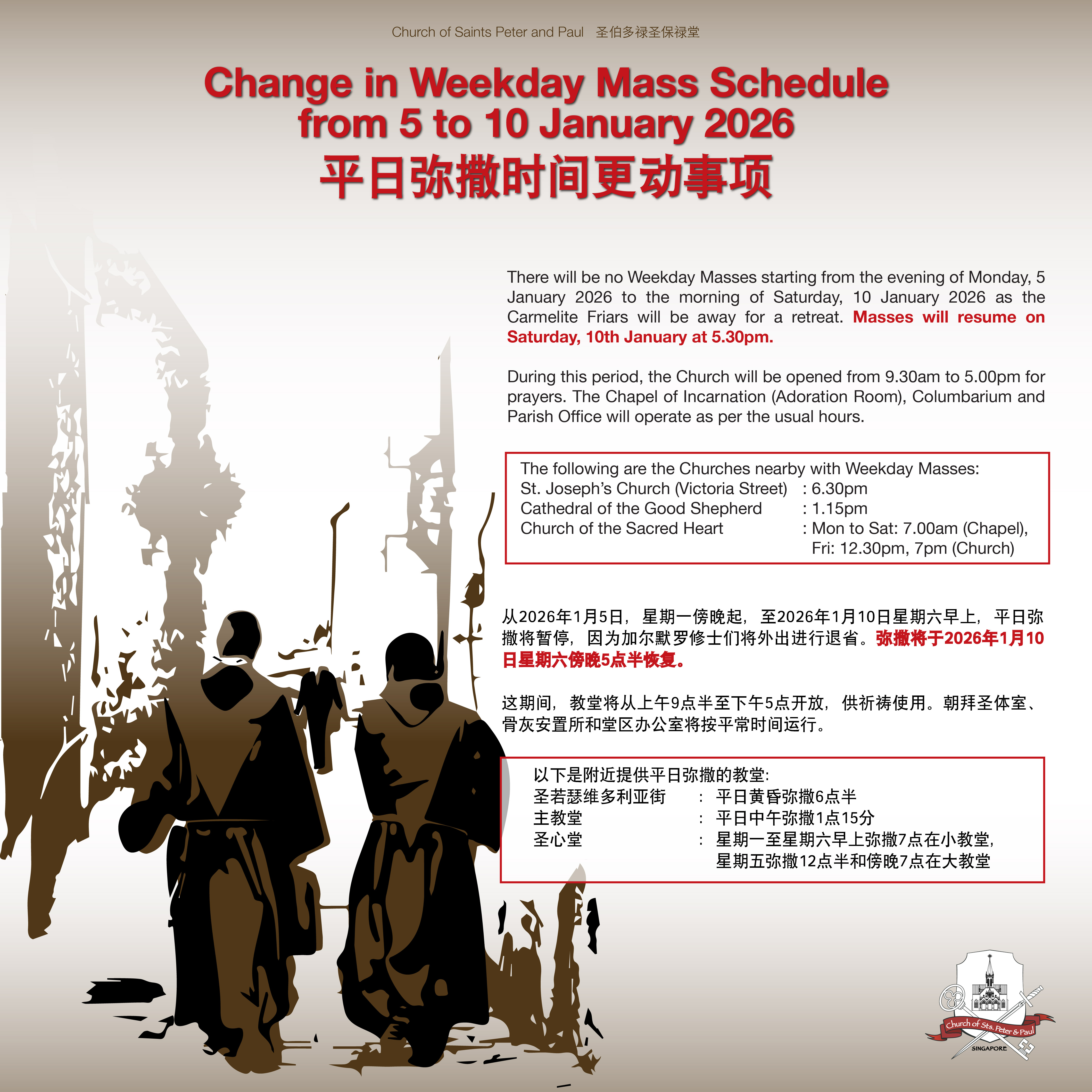The main church will only be open 1 hour before mass at 8.00pm. Only seniors with mobility issues and those who are wheelchair bound will be ushered inside the church half an hour before mass. Please co-operate with the Hospitality Ministers. Thank you.